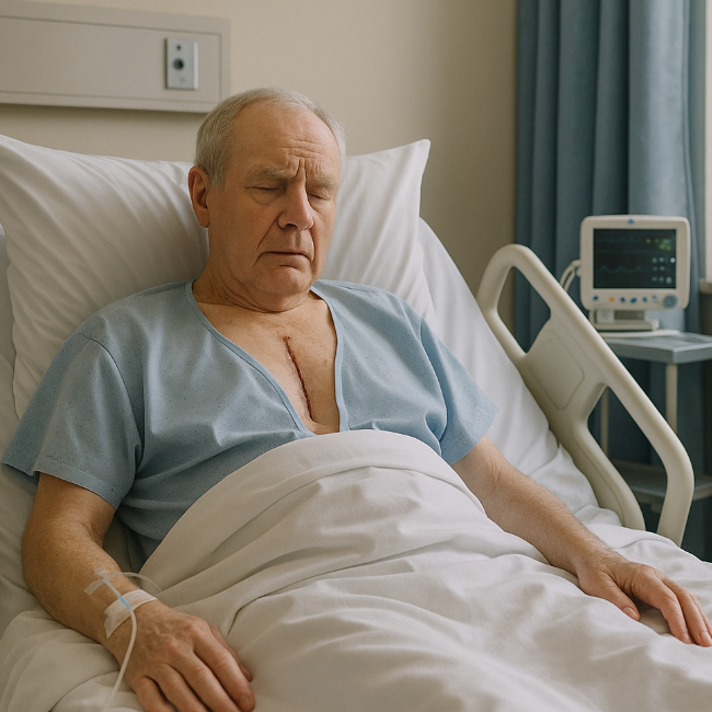 65세 남성이 대동맥판막 치환술 후 중환자실에서 일반병실로 옮긴 상태. 전신 쇠약 상태이며 일상생활에서 도움 필요. 보호자는 직장과 가족 돌봄으로 인해 상주가 어렵고, 환자는 침상 안정이 필수적임.